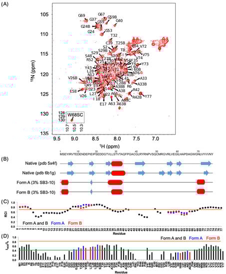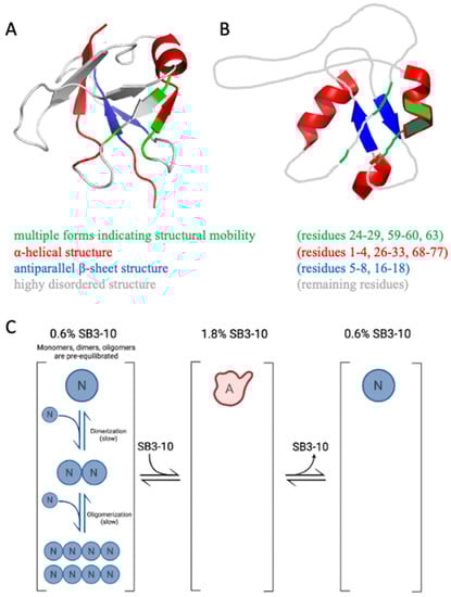 The NMR spectral properties of the SB3-10 dependent conformational state differ from those previously observed for the native NTD, as it clearly appears from the low resonance spreading of its HSQC spectrum. In particular, the NMR characterisation indicates the presence of a partially unfolded state together with the conservation of the native α-helix and of the native antiparallel β-sheet contributed by strands 1-2, although the latter is remarkably more dynamic than the native one (Figure 8A,B). On the basis of chemical shift values, two other non-native α-helices located in the N- and C-termini are detected encompassing residues 1–4 and 68–77, respectively (Figure 8A,B). Moreover, the first part of the central native helix along with the preceding β-strand (residues 24–29) and other spatially close residues that in the native structure faces this portion (residues 59,60,63) form a cluster that is present in two different forms in equilibrium, named here A and B (Figure 8A,B). The intensity of the two forms is temperature dependent, suggesting that the two forms might be related to two conformers with different compactness. For some residues, the two forms show an NH combined chemical shift difference quite marked (between 0.25 and 0.94 ppm) indicating a different chemical environment that reflects distinct conformations and also indicates structure formation under these conditions for at least one form.