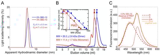 The hydrodynamic diameters of both TDP-43 NTD conformations were determined using dynamic light scattering (DLS). The distribution of light scattering intensity vs. the apparent hydrodynamic diameter revealed that TDP-43 NTD in the absence of SB3-10 has a monodispersed distribution with a hydrodynamic diameter of 5.1 ± 0.3 nm, while in the presence of 3.0% SB3-10, the hydrodynamic diameter was 4.7 ± 0.2 nm (Figure 3A). The hydrodynamic diameters expected for the TDP-43 NTD devoid of any tag are 3.23 and 4.28 nm for folded monomer and dimer, respectively [24]. Since our TDP-43 NTD has an additional unfolded tag, it can be concluded that native TDP-43 NTD in 0.0% SB3-10 occurs as a folded dimer, possibly adopting a higher-order oligomer. By contrast, the decrease of the hydrodynamic diameter of the protein domain from 5.1 ± 0.3 nm to 4.7 ± 0.2 nm upon SB3-10 addition, concomitantly with its partial unfolding suggested by the CD, fluorescence and NMR analyses reported above, suggests that the protein domain is a partially folded monomer in 3.0% SB3-10.