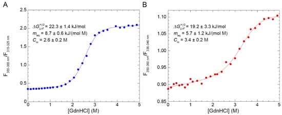 The TDP-43 NTD sample was centrifuged at 18,000× g for 15 min, at 4 °C. The experiment was performed by preparing 30 samples containing NTD at the concentration of 0.05 mg/mL (4.5 µL), in 5 mM sodium phosphate buffer, 50 mM NaCl and 1 mM, pH 7.4, and GdnHCl concentrations ranging from 0.0 to 4.9 M. In a second experiment, 30 additional samples were prepared in the presence of 3.0% SB3-10. Fluorescence spectra were acquired at 25 °C from 290 to 500 nm (excitation at 280 nm) using a 10 × 2 mm quartz cuvette on an Agilent Cary Eclipse spectrofluorimeter (Agilent Technologies, Santa Clara, CA, USA), equipped with a thermostated cell holder attached to an Agilent PCB 1500 water Peltier system. Excitation and emission slits were 5 nm. Spectra were then subtracted from blanks containing only buffers. For each spectrum, the ratio between the sum of the fluorescence in bands of 10 nm in the post-transition region and the pre-transition region was calculated. These specific bands were chosen to contain the NTD fluorescence peak observed at 0.0 M GdnHCl and 4.9 M GdnHCl for the pre-transition and the post-transition, respectively. The resulting fluorescence ratios were then plotted as a function of the GdnHCl concentration and the traces obtained were then fitted to the model edited by Santoro and Bolen [31].