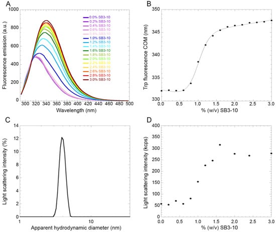 In order to explore if the conformational transition observed for TDP-43 NTD upon addition of SB3-10 was due to the formation of micelles by this compound, the solution containing 3.0% SB3-10 without TDP-43 NTD was analysed using DLS (Figure 5C). The distribution of light scattering intensity vs. the apparent hydrodynamic diameter revealed that at 3.0% SB3-10 the formation of micelles was evident, with a monodispersed distribution and a hydrodynamic diameter of 3.87 ± 0.05 nm. The overall intensity of scattered light was one order of magnitude lower than that observed when the protein was present under the same solution conditions, ruling out that the size distribution reported for the protein in Figure 3A is dominated by SB3-10. The SB3-10 concentration-dependent formation of the micelles was then studied by monitoring the light scattering intensity of the solution with an increasing concentration of SB3-10 in the absence of protein (Figure 5D). The distribution of light scattering intensity vs. SB3-10 percent concentration revealed that micelles begin to form starting from a concentration of 0.6% and then increase stabilizing at 1.4%, with a midpoint around 1.0%. It therefore appears that the SB3-10-induced conformational transition of TDP-43 NTD monitored with intrinsic fluorescence and the formation of SB3-10 micelles monitored with light scattering are fully superimposable, indicating that the conformational transition of this protein domain is induced by the formation of SB3-10 micelles.