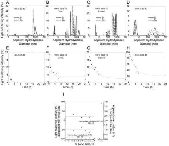 Under these conditions, the size distribution by light scattering intensity showed initially (0 h) a significant amount of dimeric or low molecular weight oligomeric state but also high molecular weight species (Figure 6A,E). Since light scattering intensity scales with the square of the mass, the latter species are initially quantitatively negligible. However, prolonged incubation leads to the slow decay of the Gaussian curve associated with the dimer/oligomer, until it disappears after 3 h (Figure 6A,E). A similar decay was observed in the presence of small concentrations of SB3-10, up to 0.6%, that is in the pre-transition region of the conversion between the two conformational states studied here, when the protein domain maintains initially its native folded state (Figure 6B,F). The apparent rate constant of decay of the DLS peak did not change significantly with SB3-10 concentration (Figure 6I, r = 0.433, p > 0.05), nor was the light scattering intensity associated with this species at time 0 h found to correlate significantly with SB3-10 concentration (Figure 6I, r = 0.303, p > 0.05).