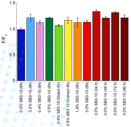 We then assayed the ability of the TDP-43 NTD samples, obtained under the various conditions tested, to bind the ThT dye and increase its fluorescence at 485 nm, which is typical of amyloid protein aggregates. The sample in 0.0% SB3-10 was found to have a fluorescence value F identical to that of free ThT in the absence of protein F0 (Figure 7). A very small increase in ThT fluorescence F relative to the F0 value was observed in all the remaining conditions after 6 h, but the increase (F0/F) was generally lower than 1.25 (Figure 7). The samples in 3.0% SB3-10 aged beyond 6 h were found to increase the ThT fluorescence to higher extents, typically between 1.25 and 1.4 (Figure 7). This is in sharp contrast with the over 5-fold fluorescence increase expected for amyloid [33,34], ruling out the formation of amyloid-like species for TDP-43 NTD under these experimental conditions.