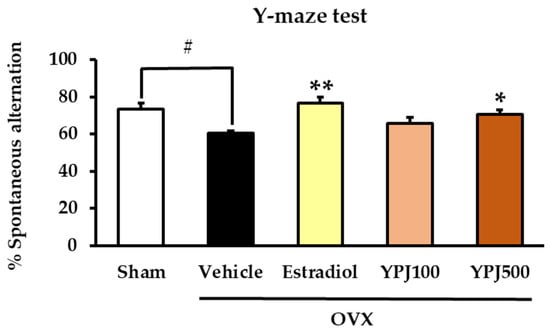 The effect of YPJ formula on cognitive performance in sham and OVX mice using the Y-maze test. Each column represents the mean ± SEM (n = 10). # p < 0.001 vs. the sham group. * p < 0.05, ** p < 0.001 vs. the vehicle-treated OVX group (post hoc Tukey test).