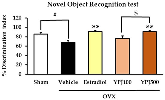 The effect of the YPJ formula on object recognition memory in the NORT. Percentage of discrimination index values in each experimental group are expressed as the mean ± SEM (n = 10). # p < 0.05 vs. the sham group. ** p < 0.01 vs. the vehicle-treated OVX group. $ p < 0.05 between YPJ treatment (post hoc Tukey test).
