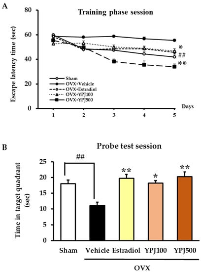 Effect of YPJ and 17β-estradiol on Morris water maze performance of OVX mice. (A) Learning achievement of the animals was analyzed during the training phase sessions. Data represent the mean ± SEM of escape latency times, 4 trials/day for 5 days. (B) Memory retrieval performance was examined in the probe test session. Data represent the mean time spent in the target quadrant ± S.E.M. (n = 10). ## p < 0.01 vs. the vehicle-treated sham group. * p < 0.05, ** p < 0.01 vs. the vehicle-treated OVX mice (post hoc Tukey test).