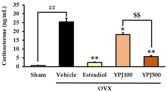 Serum CORT levels were examined in order to clarify whether the negative feedback in the regulation of the hypothalamic–pituitary–adrenal axis (HPA axis) was impaired by estrogen deprivation. Figure 4 shows that the vehicle-treated OVX mice had significantly higher serum CORT levels than the sham-operated mice. This OVX-induced elevation of serum CORT levels was significantly suppressed by daily treatment with either YPJ or 17β-estradiol (for detailed statistical analysis, see Supplementary Materials, Table S4).