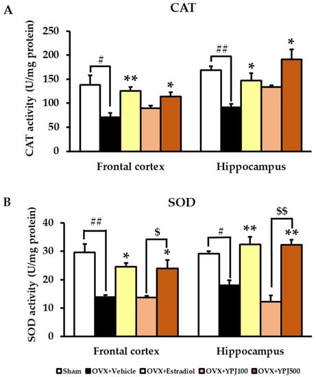 The effect of YPJ formula on antioxidant enzyme activities in the brains of OVX mice. (A) catalase (CAT) activity, (B) superoxide dismutase (SOD) activity. Data represent the mean ± SEM (n = 5). Significant effects are represented by # p < 0.05, ## p < 0.001 vs. sham, * p < 0.05, ** p < 0.001 vs. OVX vehicle-treated mice, $ p < 0.05, $$ p < 0.001 between doses of YPJ (post hoc Tukey test).