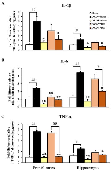 The effect of YPJ formula on inflammatory cytokine expression in the frontal cortex and hippocampus of OVX mice. (A) IL-1β, (B) IL-6, and (C) TNF-α. Data represent the mean ± SEM (n = 5). Significant effects are represented # p < 0.05, ## p < 0.001 vs. sham, * p < 0.05, ** p < 0.001 vs. vehicle-treated OVX mice, $ p < 0.05, $$ p < 0.001 between doses of YPJ (post hoc Tukey test).