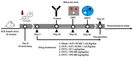 Surgical operation of OVX in mice was conducted as previously described [,]. Briefly, the mice were anesthetized by injecting sodium pentobarbital (Nembutal®: Ceva Santa Animale, Libourne, France) at a dose of 60 mg/kg (i.p.). OVX animals underwent bilateral ovariectomy by a dorsolateral incision. The subcutaneous connective tissue was closed using sterile chromic catgut sutures (VIGIKENZ®, Penang, Malaysia). The operation wound was cleaned with 70% ethanol and povidone–iodine solution (BETADINE®, Stamford, CT, USA). The mice were randomly separated into twelve mice in each group. The sham-operated animals underwent all surgical operations without removing the ovaries. After a 3-day recovery period, OVX animals were divided into four groups: (1) ovariectomy (OVX), (2) ovariectomy + 1 μg/kg 17β-estradiol (OVX+E2), (3) ovariectomy + 100 mg/kg YPJ (OVX + YPJ100), and (4) ovariectomy + 500 mg/kg YPJ (OVX + YPJ500). The sham and OVX groups were orally administered corn oil (vehicle). 17β-Estradiol was intraperitoneally administered. YPJ powder was suspended in corn oil and orally administered once daily for 8 weeks. On behavioral testing days, administration was conducted 1 h before the behavioral assessment. The YPJ dose was derived from the clinical dose (1600 mg/day) prescribed in the hospital. This dose was converted into the appropriate dose for mice by the following equation: human equivalent dose (HED, mg/kg) = mouse dose (mg/kg) × mouse Km/Human Km), where Km is the correction factor []. The experiment framework is summarized in Figure 8.