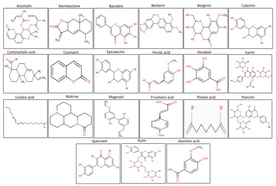 The physico-chemical analysis of the selected compounds was assessed using a computational tool (swissAMDE software) [43]. The various properties that were evaluated included molecular weight, LogP, the number of rotational bonds, the number of H-bond acceptors, the number of H-bond donors, and surface area [43]. The compounds showed variable physico-chemical properties, as shown in Table 1. Icariin showed higher molecular weight, while the linoleic acid showed the lowest molecular weight. Rutin showed the lowest LogP value, while linoleic acid exhibited the highest LogP value. The linoleic acid showed the highest rotational bonds, while the matrine, coumarin, and alactolactone revealed the lowest rotational bonds. Similarly, icariin showed the highest H-bond acceptors, while linoleic acid and continentalic acid showed the lowest H-bond acceptors. Rutin showed the highest H-bond donor value, while anomalin, alantolactone, matrine, coumarin, and berberin exhibited a lower H-bond energy. Icariin showed the maximum surface area, while coumarin showed the lowest surface area, as shown in Table 1.