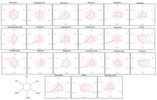 Radar analysis was performed for all of the studied compounds, which is a computational tool that gains ideas about the rule, followed by compounds such as FLEX, LIPO, SIZE, POLAR, INSATU, and INSOLU [45]. These parameters provide an insight into the drug likeness behavior of the studied compounds. The bioavailability radar analysis was analyzed using the computational approach (pink area represent optimal range of particular property) using SwissADME software. The LIPO represents lipophilicity as the XLOGP3, size represents the molecular weight of the compound, POLAR (topological polar surface area) represents the polarity, INSOLU represents the insolubility in water by log S scale, INSATU represents the instauration as per fraction in the carbon in the SP3 hybridization, and FLEX represents the flexibility as per rotatable bonds. The anomalin, matrine, pimelic acid, alantolactone, and bergenin showed promise as a bioavailability radar, as shown in Figure 2.