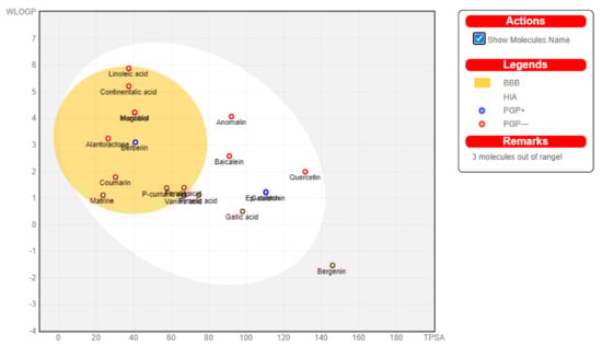 The SwissADME software was used for the boiled egg analysis [46]. The boiled egg analysis provides useful information about the BBB, HIA, PG+, and PG- [47]. The compounds that showed BBB permeability included linoleic acid, continentalic acid, magnolol, honokiol, alantolactone, berberine, coumarin, matrine, p-cumaric acid, ferulic acid, and vanillic acid while the rest of the compounds showed intestinal absorption, but no BBB permeability, as shown in Figure 3.