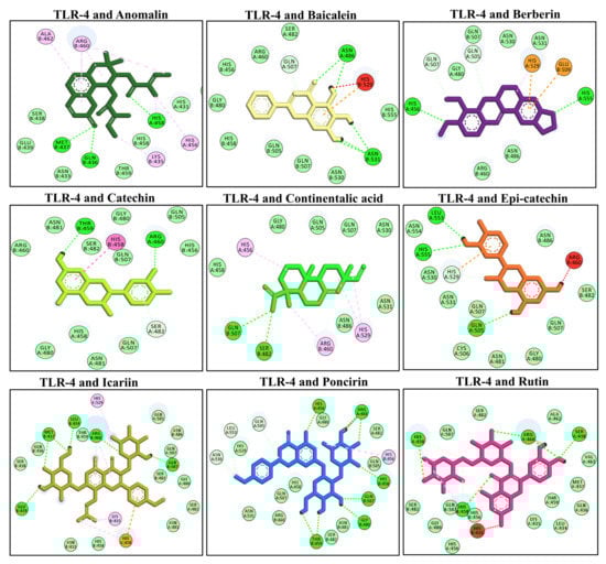 The TLR-4 is a surface receptor that interacts with the LPS to induce the downstream signaling and produce the inflammatory response [48]. The molecular docking analysis of the selected compounds was performed using AutoDock Vina software against the TLR-4 receptor. The compounds showed different affinity toward the target protein (i.e., TLR-4). Among these compounds, anomalin, baicalein, berberin, catechin, continentalic acid, epi-catechin, icariin, poncirin, and rutin have shown the lowest binding score. These compounds interacted via multiple hydrophilic and hydrophobic bonds. The anomalin exhibited three H-bonds (Met B437, His A458, Gln B436) with the TLR-4 receptor. Similarly, baicalein binds with the TLR-4 protein via two H-bonds (ASN A486, ASN B531), berberin binds via two H-bonds (His A456, His A555), catechin binds via two H-bonds (Thr B459, ARG A460), continentalic acid binds via two H-bonds (Gln B507, Ser B482), and epi-catechin binds via three H-bonds (Leu A553, His A555, Gln A505) with TLR-4. Moreover, icariin binds with the TLR-4 via five H-bonds (Leu B434, Arg B460, Gln B507, Met B437, Glu B439), poncirin binds by five H-bonds (His A456, Arg A460, His B458, Gln B507, Gly B480, Thr B459), and rutin via four H-bonds (His A458, Arg A460, Ser A438, His B458), as shown in Figure 4. The molecular docking energies are represented in kcal/mol and are presented in Table 5.