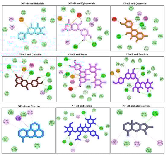 NF-κB activation is followed by interaction of the LPS with the TLR-4 receptor. NF-κB translocates to the nucleus to induce the pro-inflammatory cytokine genes and aggravates the underlying inflammation [48]. Several compounds have shown promising binding affinities with NF-κB via multiple hydrophilic and hydrophobic bonds. The compounds that showed the highest negative binding energies included alantolactone, catechin, epi-catechin, icariin, poncirin, quercetin, and rutin. Alantolactone binds with one H-bond (Ard B161), catechin via four H-bonds (Thr B122, Gly B162, Gly B181, Gly B180), epi-catechin via two H-bonds (Glu A89, Gln A132), icariin via four H-bonds with the NF-κB (Arg B54, Ser B240, Asn B247, Arg B51), poncirin with four H-bonds (Leu B140, Ser B110, Asp B118, Arg B154), quercetin via two H-bonds (Arg B161, Phe B225), and rutin showed four H-bonds with NF-κB (Val B169, Gln B196, Gln B201, Ser B171), as shown in Figure 5. The molecular docking energies are represented in kcal/mol and are presented in Table 5.