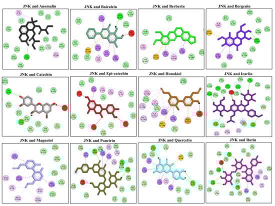 The molecular docking interaction was performed targeting the mitogen activating protein kinases (MAPKs) [49]. The MAPK activation is under the influence of upstream signaling proteins such as MyD88, TIRAF, and TRAP [50]. The phosphorylation of MAPKs triggers the activation of the downstream transcription factor (i.e., AP-1). The phosphorylated JNK interacts with the downstream transcription factor and induces the expression of concerned genes. The molecular docking analysis showed the highest negative binding energies with the anomalin, alnatolactone, baicalein, berberin, bergenin, catechin, epi-catechin, honokiol, icariin, magnolol, poncirin, quercetin, and rutin. Anomalin binds with one H-bond (Asn A194), baicalein (Glu A147), bergenin (Met A149), catechin bind with one H-bond (Lys A93), icariin binds with seven H-bonds (Asp A150, Ala A151, Lys A191, Lys A93, Ile A70, Ser A193, Gln A75), poncirin via three H-bonds (Met A 149, Lys A93, Asp A207), quercetin via two H-bonds (Gln A75, Glu A147), and rutin via four H-bonds with the JNK protein (Lys A93, Asn A194, Asp A189, Gln A75), as showbn in Figure 6. The molecular docking energies are represented in kcal/mol and are presented in Table 5.