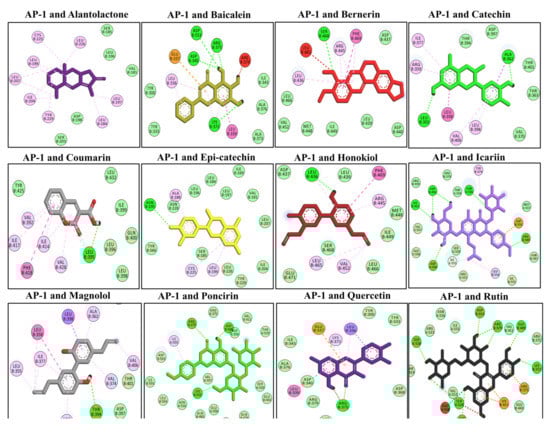 The molecular docking analysis of the selected compounds with the AP-1 protein using AutoDock Vina software. The molecular docking showed binding of the studied ligand with AP-1 via multiple hydrophilic and hydrophobic bonds. The ligand and protein interactions were visualized in Discovery Studio Visualizer_16 and ligands whose negative binding energy was high were plotted.