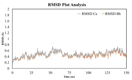 The MD simulation analysis using the root mean square deviation (RMSD) plot. The MD simulation was performed to assess the RMSD value of the TLR-4 and rutin complex for 150 ns. The MD simulation analysis showed a RMSD score within the acceptable range and no significant deviation was observed.