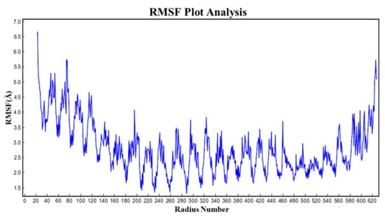 The RMSF analysis exhibited the flexibility of the residues. As evident from Figure 9, the flexibility pattern was almost similar and was noted between 4.05 to 4.25 in all secondary components, except for the region where the loop was located and showed an increased fluctuation of the residues, as shown in Figure 9. However, the residue of the active site remains stable during the process of simulation because of the active site recognition of the ligand. The findings of the simulation showed that TLR-4 was stabilized following binding of the rutin ligand (i.e., the binding of the ligand markedly affected the fluctuation of the residue) and is due to the internal residue’s disturbance by the ligand interaction with TLR-4, which influences the correlated and non-correlated motions.