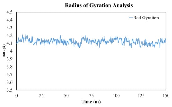 The radius of gyration (RoG) provides insights into the stability of the folding and unfolding of protein during ligand interaction within the protein. The high compactness (more folding) indicates a low Rdg value and higher structural stiffness, while low compactness (more unfolding) indicates a high RdG and less structural stiffness. In short, the RdG value tends to provide information about the system compactness during simulation. As evident from Figure 10, the ligand–protein complex showed a gyration score of 1.5 to 5.5 Å across the whole duration of the simulation. Relative high fluctuation at the C- and N-terminal of the protein was due to large-scale conformational motions. Based on the MD simulation data, we can decipher the overall compactness of the complexes, which is greatly influenced by the binding and unbinding of the ligand within the protein.