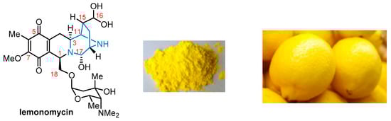 The golden era of antibiotics propelled by the discovery of penicillin has been challenged by a growing crisis in antibiotic resistance worldwide and a decline in investments in the development of novel antibiotics [1]. Natural products are the mainstays of modern antibiotic drugs. Although, only approximately two hundred of 28,000 have been used clinically [2]. The chemical diversity of natural products, including those structures known for decades on the shelf, remains a huge space that has the potential to be a privileged starting point to explore. Lemonomycin (1) was first isolated from a fermentation broth of Streptomyces candidus (LL-AP191) in 1964 by Whaley and coworkers at the Lederle Laboratory of American Cyanamid Company (Figure 1) [3]. A few grams of lemonomycin hydrochloride were obtained after separation and purification. Its name was based on the color of lemon yellow about the corresponding globular substance. According to the primary 1H nuclear magnetic resonance (NMR) and infrared (IR) spectroscopy, the researchers concluded that the structure of lemonomycin should contain hydroquinone, as well as N-methyl and O-methyl functional groups. At the same time, lemonomycin released dimethylamine after the degradation experiment. The biological evaluation of lemonomycin revealed its broad antimicrobial activity against various microbial pathogens [3,4]. Unfortunately, lemonomycin was found to be fatal at a dose higher than the therapeutic dose, indicating why this potent antibiotic was shelved for decades without further characterization and derivatization.