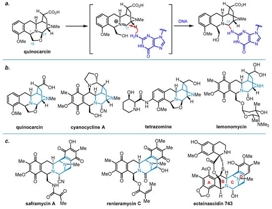 Representative THIQ antitumor antibiotics and mode of action (MoA). (a) Mode of action (quinocarcin as example); (b) THIQs bearing a diazabicyclo [3.2.1]octane core; (c) THIQs bearing a diazabicyclo [3.3.1]nonane core.