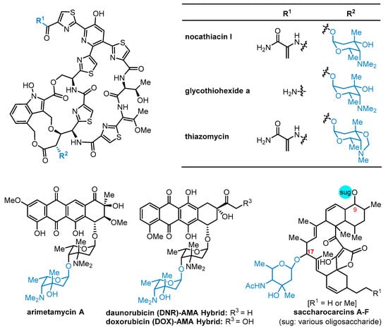 Antibiotics bearing 2,6-dideoxy-4-aminoglycoside (blue).