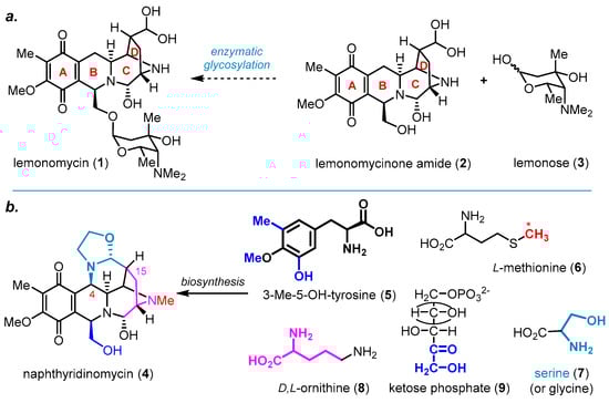 Biosynthetic proposal of lemonomycin (1) and naphthyridinomycin (4). (a) Proposed glcosylation in biosynthesis; (b) Biosynthesis of naphthyridinomycin.