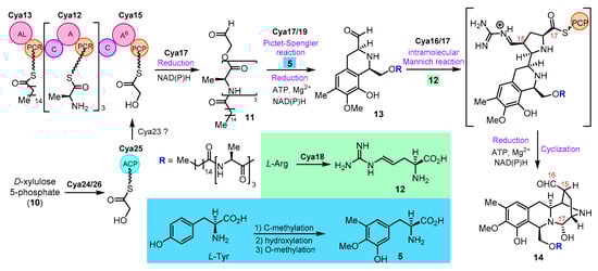 In 2013, Oikawa and coworkers performed gene cluster identification and biochemical analysis of substances in the tetrahydroisoquinoline family, from which the biosynthetic pathways quinocarcin and SF-1739 were proposed (Scheme 2) [19]. On the starting template of Cya13/12, fatty acid and L-Ala units were loaded, while the template Cya15 was likely responsible for carrying the glycol unit [14] from the ACP of D-xylulose-5-phosphate (10) to make its A domain active. Condensation with L-aminolevulinic acid and the subsequent reduction delivered aldehyde 11 by Cya17. In the separated pathway, L-tyrosine was converted to 5 through a series of C-methylation, hydroxylation, and O-methylation. By conducting in vitro assays, Cya18 was confirmed to be α-ketoglutarate-dependent dioxygenase catalyzing the dehydrogenation of L-Arg to form L-(E)-4,5-dehydroarginine (12). In the Cya17/19 complex, adenylated 5 with Cya19 was transferred to Cya17-PCP, followed by a Cya17-catalyzed Pictet–Spengler reaction with the leader peptide-tethered aldehyde 11 to generate aldehyde 13, with the assistance of reduction by the Cya17/19 complex. With the activation of 12 under the condition of adenylation provided by Cya16/17, the Cya17-PS domain was used to selectively catalyze the coupling of 12 and 13 via an intramolecular Mannich reaction, reductive cleavage, and spontaneous cyclization to release hemiaminal 14, bearing an endo-configuration at C15, providing an essential carbon framework of SF-1739 and congeners, including aclidinomycins and lemonomycin.
