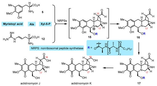 Ju and coworkers recently isolated eleven THIQ-like aclidinomycins from deep-sea-derived Streptomyces niveus SCSIO 3406 by genome orientation and the one-strain-many-compounds (OSMAC) strategy [20]. Aclidinomycin J and aclidinomycin K were isolated as amorphous yellow powders and found to have the characteristic core structure of lemonomycin, except for the inverse stereochemistry at C15 and saturation at C17. As indicated in Oikawa’s investigation [19], the specific route is possibly initiated from xylulose-5-phosphate (Xyl-5-P), aminolevulinic acid (Ala), myristoyl acid, a L-tyrosine derivative (5), and L-(E)-4,5-dehydroarginine (12) as the starting materials (Scheme 3). The discovery of aclindinomycins provides new insights into the molecular logic of the complex polycyclic architecture.