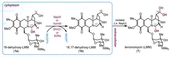 Very recently, Tang and coworkers reported an interesting mechanism of self-resistance when the bacterial host produced lemonomycin and naphthyridinomycin [21]. In the fermentation of S. candidus LL-AP191, 16-dehydroxy-LMM (1a), was identified instead of LMM (Scheme 4). Large-scale enzymatic reactions were performed to deliver the C17-reduced form 1b, indicating additional reduction and oxidation steps occurring at different times and locations. As a self-protection strategy, the pharmacophore of the iminium ion at C17 was largely reduced in the cytoplasm to maintain a low concentration for the host. The additional oxidase NapU (flavoprotein) realized the extracellular oxidation step at C17 and C16 to generate the highly potent antibiotic LMM (1). The self-resistance strategy poses a challenge to develop a sophisticated biosynthetic pathway to reharvest such potent antibiotics in engineered biosynthetic machinery [22].