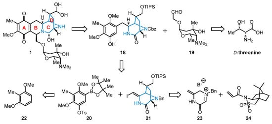 The unique structure and potent antimicrobial activity have attracted considerable interest in several laboratories. Two groups completed the total synthesis, and five groups accessed the aglycon or the key intermediates to constitute the virtual synthesis. The Stoltz group was the first team to disclose the total synthesis of lemonomycin. As shown in Scheme 5 [4,23], the retrosynthetic plan features the Pictet–Spengler reaction of amide 18 with glycosylated aldehyde 19. Fragment 18 could be readily constructed by the aryl boronic ester 20 and vinyl iodide 21 via Suzuki cross-coupling. The characteristic diazobicyclic intermediate 21 was successfully established between dipolar precursor 23 and Oppolzer sultam derivative 24 by 1,3-dipolar cycloaddition, a novel tactic initially developed by Joule and coworkers [24,25,26] and widely adopted in the syntheses of other THIQ alkaloids [6,7]. Glycosylated aldehyde 19 bearing an amino sugar could be prepared from D-threonine in multiple steps.