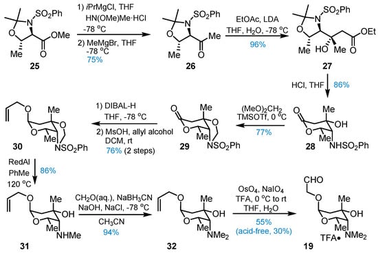 Following the literature-known protocols, methyl ester 25 was prepared from D-threonine in three steps by the benzenesulfonyl group replacing the original Cbz protection. After the aminolysis of 25 with N,O-dimethylhydroxylamine, the resulting Weinreb amide was converted into methyl ketone 26 in 75% yield after two steps (Scheme 6). Aldol addition with ethyl acetate produced a virtually single diastereomer 27 via the Felkin–Ahn trajectory [27,28]. After treatment of β-hydroxy ester 27 with hydrochloric acid, the corresponding lactone 28 reacted with dimethoxymethane to form oxazolene 29 by using TMSOTf as a catalyst. The subsequent reduction by DIBAL-H and dehydration with allyl alcohol delivered α-allyl ether 30. The reductive cleavage of the benzenesulfonyl group by Red-Al and the subsequent reductive methylation formed allyl glycoside 32 in excellent yield. The oxidative cleavage of the alkene by Lemieux–Johnson reagent [29] proceeded smoothly to yield aldehyde 19 as a trifluoroacetate salt (55%) and in an acid-free form (30%).