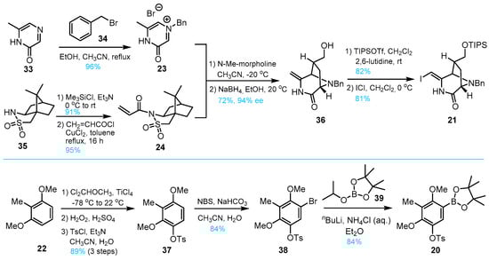 Bromide salt 23 as a precursor for the requisite 1,3-dipole cycloaddition was readily prepared using benzyl bromide 34 and 6-methyl-2(1H)-pyrazinone in anhydrous ethanol and acetonitrile at the reflux in a 96% yield (Scheme 7). However, dipolarophile 24 was obtained by Kocieński’s protocol [30] with silylative activation and the subsequent acylation by acryloyl chloride in the presence of cupric chloride. Accordingly, N-Me-morpholine was used for the deprotonation of salt 23 to form an oxidopyrazinium salt for the 1,3-dipolar cycloaddition with 24. Immediate treatment by NaBH4 carried out the reductive removal of the sultam auxiliary to deliver enamide 36 in good yield and a high stereoselectivity (94% ee), indicating an excellent diastereoselectivity achieved in the cycloaddition event. The protection of the primary alcohol with a bulky silyl group and the next iodination produced vinyl iodide 21 as a single isomer in good yield.