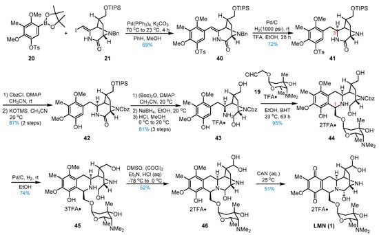 Arylboronate 20 was effectively synthesized from 2,6-dimethoxytoluene 22 in five straightforward steps, including Friedel–Crafts acylation, Baeyer–Villiger oxidation, tosylation, bromination, halogen exchange, and subsequent trapping by the boron ester (Scheme 6). With two fragments 20 and 21 in hand, Suzuki cross-coupling catalyzed by Pd(PPh3)4 proceeded to deliver the requisite aryl enamide 40 on the gram scale with a good isolated yield (69%) (Scheme 8). The hindered trisubstituted enamine was subjected to heterogeneous hydrogenation at 1000 psi to generate 41 with excellent diastereoselectivity. Reprotection of the amine group by the Cbz group and the subsequent removal of the p-toluenesulfonyl group by potassium trimethylsilolate (KOTMS)-promoted hydrolysis released the cyclic amide in 42. To release amine for the programmed Pictet–Spengler reaction, treatment with (Boc)2O enabled the complete reduction of the amide group. The subsequent acid workup produced amino triol 43 as a form of trifluoroacetic acid (TFA) salt in 81% yield after three steps. The key Pictet–Spengler cyclization of 43 with lemonose-derived aldehyde 19 (TFA salt) was performed in a foil-wrapped vial for 63 h to give bis-trifluoronate 44 in a 95% yield. Again, the PS-cyclized product was isolated in the form of a single diastereomer at C1. Hydrogenolysis and Swern oxidation resulted in hemiaminal bis-trifluoronate 46 bearing a hydrate form of aldehyde. Finally, oxidation by cerium ammonium nitrate (CAN) to convert phenol into benzoquinone furnished bis-trifluoronate (−)-lemonomycin (1), which was completely identical to the reported data [5], and thus fully validated the stereochemistry of lemonomycin.