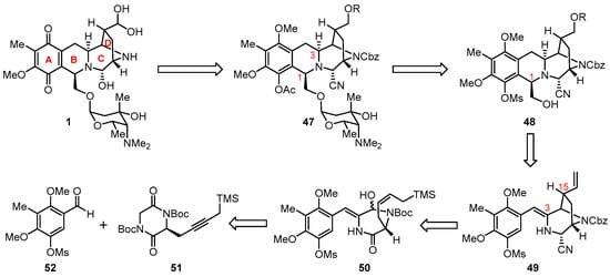 Given novel aminosugars in various potent antibiotics, the Fukuyama group proposed a late stage of glycosylation in the synthetic design to be versatile for future derivatization. In 2012, the total synthesis of lemonomycin was reported by this group [31]. As shown in Scheme 9, aglycon 48 was anticipated by reducing the enamine in 49 and its subsequent cyclization via the Pictet–Spengler reaction. The 3,8-diazabicyclo [3.2.1]octane skeleton was established by the Hosomi–Sakurai reaction, a strategy being executed in their previous syntheses toward quinocarcin and other alkaloids [32,33,34]. Critical intermediate 50 could be generated by a Perkin-type reaction of diketopiperazine 51 and aldehyde 52. The latter aldehyde was derived from 2,6-dimethoxybenzene in five steps by a modification of Stoltz’s route [22].