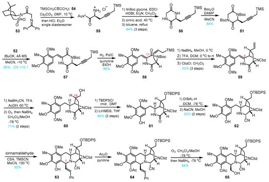The synthesis commenced with the application of glycine-derived Oppolzer sultam 53 for asymmetric alkylation with propargylic iodide 54 [35] to deliver a single diastereomer of 55 after hydrolysis in an ether solution of HCl (Scheme 10). After condensation with N-tert-butyloxycarbonyl (Boc) glycine, the intermediate derived from the acidic removal of the Boc group was then cyclized to release diketopiperazine 56 in a combined 84% yield after three steps. Two secondary amides were masked by the Boc protection, and the resulting cyclic amide underwent Perkin-type condensation [36], with aryl aldehyde 52 to favor (Z)-enamine 57 (Z/E = 10:1) in an excellent yield. The triple bond in 57 was partially reduced by the Lindlar catalyst, while the carbonyl group at C11 was reduced to hemiaminal with NaBH4 in an aqueous methanol solution. The acid-promoted Hosomi–Sakurai reaction successfully constructed the bridged ring of 59 with almost perfect stereoselectivity. Reprotection of the amine with the Cbz group gave lactam 59 in a 51% overall yield in three steps. In contrast to Stoltz’s synthesis, trisubstituted enamine was smoothly reduced by NaBH3CN under acidic conditions, and the stereochemistry at C1 was satisfied. Ozonolysis and immediate reduction furnished a hydroxymethyl group at C15 in 60. Functional group manipulations, including protection by the tert-butyldiphenylsilyl (TBDPS) group and deprotection of the mesyl group by lithium bis(trimethylsilyl)amide (LiHMDS) [37], generated the phenol derivative 61. To improve the reactivity of the amine, the lactam group was first reduced by diisobutylaluminum hydride (DIBAL-H), and the resulting hemiaminal was converted to amino nitrile 62. To complete the synthesis of the aglycon, cinnamaldehyde was merged into the desired Pictet–Spengler cyclization in the presence of CSA and TMSCN, and then the tetracyclic skeleton 63 was formed at 92%. The high stereoselectivity achieved was found to be crucial under thermodynamic control. After acetylation, the requisite aglycon 65 was completed in an 84% yield after ozonolysis and subsequent reduction.