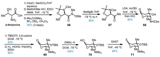 The synthetic route of lemonose 71 was slightly modified from the previous procedure [22]. The initial amine protection group was chosen as the Cbz group instead of the benzenesulfonyl group in a previous synthesis (Scheme 11). After the formation of methyl ketone 67 through Weinreb amide, the aldol reaction and deprotection afforded lactone 68. The tertiary alcohol was protected by the tert-butyl(dimethylsilyl (TBS) group, followed by the removal of the Cbz group and reductive amination in a one-pot method. The corresponding amine 69 was subjected to partial reduction by DIBAL-H to release acetol 70. Finally, fluorination by treatment with dimethylaminosulfur trifluoride (DAST) [38] resulted in glycosyl fluoride 71 in 84% yield.