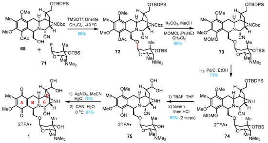 - Siengalewicz, P.; Rinner, U.; Mulzer, j. Recent progress in the total synthesis of naphthyridinomycin and lemonomycin tetrahydroisoquinoline antitumor antibiotics (TAAs). Chem. Soc. Rev. 2008, 37, 2676–2690. [Google Scholar] [CrossRef]