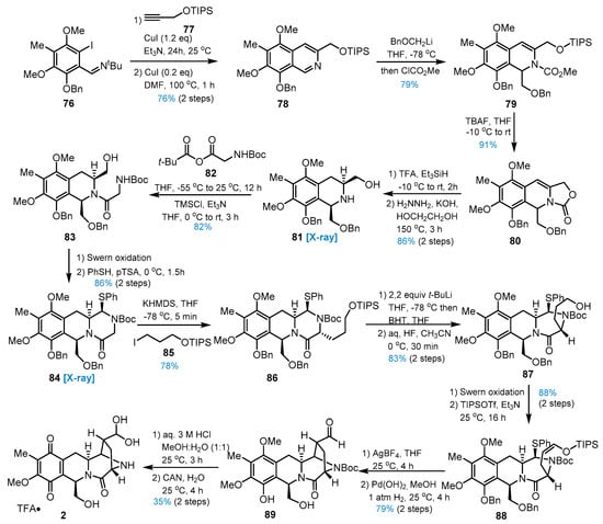 In 2005, Magnus and coworkers devised a Mannich reaction-based strategy to construct the aglycon, lemonomycinone amide (2) [39,40]. The synthesis began with 2,4-dimethoxy-3-methylbenzaldehyde as the starting material to prepare a fully substituted aryl aldehyde-derived imine 76 in a seven-step sequence [41]. Copper-mediated cross-coupling between 76 and silylated propargyl alcohol 77 under Castro conditions [42] and subsequent aromatization resulted in isoquinoline 78 in a 76% overall yield (Scheme 14). The subsequent addition of benzyloxymethyllithium [43] and methyl chloroformate furnished the substitution on the B-ring. The removal of the triisopropylsilane (TIPS) group by TBAF also promoted cyclization to generate oxazolidinone, which was suitable for ionic hydrogenation by TFA-Et3SiH and immediate hydrolysis to afford cis-amino alcohol 81 in a high yield. After structural confirmation by X-ray analysis, compound 82 was introduced into a glycine motif via an activated reagent, n-tert-butoxycarbonyl glycine. Swern oxidation initiated the formation of hemiaminal in a mixture of diastereomers (dr 3/2) [44], which was further converted into the thermodynamically stable thioaminal 84 (X-ray) in excellent yield. Single diastereomeric 86 was obtained from the alkylation of 84 and iodide 85 by potassium bis(trimethylsilyl)amide (KHMDS) as a base. To invert the stereochemistry at C13, the treatment of 86 by tBuLi and trapping by a hindered proton source, butylated hydroxytoluene (BHT), gave the α-configured isomer which was desilylated to produce alcohol 87. After Swern oxidation, the resulting aldehyde was converted to silyl enolate 88 in 88% yield. The key Mannich-type cyclization was initiated by thiophile AgBF4, and a single stereoisomer at C15 of the aldehyde was obtained. The high stereoselectivity is largely attributed to the steric bulk of the C1 substituent (BnOCH2) in the axial orientation. After hydrogenation of two benzyloxy groups by Pearlman’s catalyst Pd(OH)2 [45], alcohol 89 was subjected to the removal of the Boc group and hydration of the aldehyde group at C15 under acidic conditions. The final oxidation by CAN completed the synthesis of lemonomycinone amide (2) in 35% yield as a racemic form.