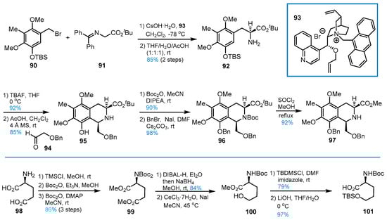 In 2008, the Zhu group devised a similar Mannich-type strategy to synthesize lemonomycinone amide (2) in an optical form [46]. In contrast to the abovementioned strategies, they first established the C13 stereochemistry by the asymmetric alkylation of glycine-derived imine 91 with functionalized benzyl bromide 90 in the presence of the Corey–Lygo phase transfer catalyst 93, [47,48,49] O-(9)-allyl-N-(9′-anthracenylmethyl) cinchonidium bromide, producing amino ester 92 in an 85% yield (Scheme 15). The subsequent addition of TBAF for desilylation to release the phenol group enabled the Pictet–Spengler reaction of benzyloxy acetaldehyde 94 to deliver a single cyclized product 95. After protection and ester exchange, compound 97 was obtained in excellent yield. To circumvent the linear manipulation in the Magnus synthesis [40], the Zhu group adopted L-glutamic acid (98) to introduce the four-carbon unit. However, the separated synthesis of 101 required seven steps to install the proper functional groups. After three steps of protection, compound 99 was subjected to reduction [50] at the distal ester. The subsequent additional three steps of protection and deprotection gave amino acid 101.