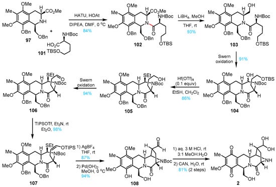 The condensation of isoquinoline 97 and amino acid 101 was carried out to produce amide 102 without detectable epimerization in the presence of hexafluorophosphate azabenzotriazole tetramethyl uranium (HATU) and N,N-diisopropylethylamine (DIPEA) in dtmethylformamide (DMF) with a yield of 84% (Scheme 16). The C-ring was formed by Swern oxidation after 102 was reduced to alcohol 103 by LiBH4 to form semiacetal 104 as a mixture of diastereomers (dr 3/2). Subsequent treatment with Hf(OTf)4 [51] and EtSH delivered alcohol 105 as a single diastereomer under thermodynamic control. After Swern oxidation and the subsequent formation of silyl ether by TIPSOTf and triethylamine, the programmed Mannich-type cyclization promoted by AgBF4 proceeded smoothly to deliver the requisite aldehyde with the correct stereochemistry. Following Magnus’s condition [40], debenzylation by Pd(OH)2 afforded alcohol 108. After the modification of the previous hydrolysis under acidic conditions, the aldehyde group was hydrated and then oxidized by CAN to give lemonomycinone amide (2) in an 81% yield.