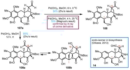 A particularly interesting phenomenon was discovered during the hydrogenolysis of 107a by the Perlman catalyst (Pd(OH)2) [45] to remove two benzyl groups at room temperature (12 h at r.t. versus 6 h at 0 °C). In contrast to Magnus’s observation [39,40], the endo-isomer 108a (15-epi-108) was isolated in an 85% yield under identical conditions (Scheme 17). Although the endo-isomer is thermodynamically less favorable for steric reasons, the proximity of the C1-hydroxymethyl group may drive the equilibrium toward the final formation of hemiacetal 108b, providing mechanistic insights into the stereochemical outcome of the kinetically favored endo-adducts in the proposed biosynthesis [19].