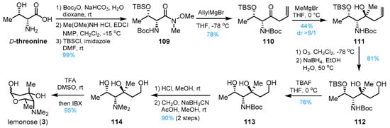 Three years later, Zhu and coworkers continued to finish the asymmetric synthesis of lemonose (Scheme 18). [52] Threonine was again selected as the chiral pool, which was first converted to Weinreb amide 109 after three steps. Subsequently, two additions by different Grignard reactions readily furnished 111 with all requisite stereogenetic centers. The terminal double bond was then subjected to ozonolysis and a subsequent reduction to deliver alcohol 112 in an 81% yield for two steps. After global deprotection, double reductive amination with HCHO in the presence of NaBH3CN furnished 114. To attenuate the impact of tertiary amines, the pretreatment of trifluoroacetic acid successfully chemoselectively converted the primary alcohol to aldehyde by O-iodoxybenzoic acid (IBX) [53] and then cyclized to form lactol 3 (lemonose) in a total of 10 steps and an 18% overall yield. However, the complete assembly of lemonmycin (1) was not disclosed despite that both the given glycosylation of aglycon 2 with protection-free lemonose (3) were obtained.