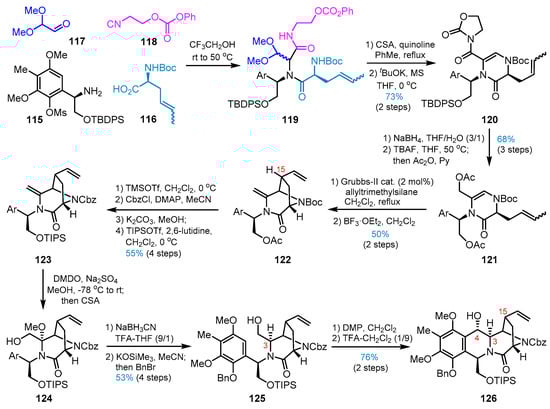 Early in 2004, the Fukuyama group developed an intriguing Ugi-4CR to assemble four readily prepared fragments for the rapid construction of the polycyclic core of lemonomycin in a highly convergent manner, although no subsequent synthesis was reported [54]. Amino alcohol 115, amino acid 116, glyoxyaldehyde acetal 117, and isocyanide 118 were subjected to the Ugi reaction in CF3CH2OH to generate dipeptide 119, followed by treatment with acid and cyclization under basic conditions to give N-acyloxazolidinone derivatives 120 in a good yield (Scheme 19). After the reduction and protection exchange, diacetate 121 was subjected to cross metathesis to introduce allyltrimethylsilane, which was elaborated to an intramolecular Hosomi–Sakurai reaction catalyzed by BF3•Et2O in an excellent yield, and complete stereochemical control at C15. To smoothly transform 122 into the desired alcohol 125, they had to operate a four-step sequence of exchanging two protecting groups. The oxidation of enamide 123 by dimethyl dioxirane (DMDO) resulted in 124, which upon treatment with TFA was reduced by NaBH4 to furnish the stereogenic center at C3 from a less hindered exo-face. Enhancement of the nucleophilicity of the aromatic ring by KOSiMe3 the promoted hydrolysis of the Ms group and benzylation in one pot. Alcohol 125 was oxidized by the Dess–Martin periodinane (DMP), and subsequent Friedel–Crafts cyclization yielded 126 with the requisite tetracyclic core of lemonomycin. Although they did not elaborate the current strategy to the final target, the key Hosomi–Sakurai cyclization was indeed successfully implemented into the later second-generation synthesis of lemonomycin (1) [31].