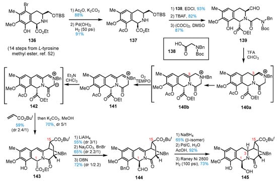 The latest effort devoted to the synthesis of LMM was reported in 2013 by Williams and coworkers [56]. They devised a 1,3-dipolar cycloaddition of functionalized oxidopyrazinium at a late stage of synthesis (Scheme 21). The synthesis was commenced from tetrahydroisoqinoline 137, which was derived from L-tyrosine methyl ester in 14 steps with a known protocol [57]. After acetylation and debromination, condensation with 139 and the subsequent transformation of the alcohol into aldehyde 140 resulted in a good overall yield. Treatment with TFA in CHCl3 generated an iminium salt intermediate that was readily oxidized in the presence of (2,2,6,6-tetramethylpiperidin-1-yl) oxidanyl (TEMPO) and oxygen, followed by the addition of triethylamine to result in oxidopyrazinium 143. An immediate trap by tert-butyl acrylate smoothly afforded the requisite tetracyclic skeleton 144 with moderate facial selectivity (dr 2.4/1). The mixture was subjected to the following four steps: epimerization, partial reduction, benzylation, and isomerization at C1, and then the desired β-isomer at C1 was dominant. The reduction of aldehyde by NaBH4, debenzylation by Pd/C, and hydrogenation from the bottom face by Raney nickel under a high pressure of hydrogen eventually delivered the advanced intermediate 146. The overall efficiency was largely detracted by the lengthy synthesis of aldehyde 140 and low diastereoselectivity of the intermolecular 1,3-dipolar cycloaddition. Therefore, a further transformation to aglycon 2 might not be facile due to the difficult accumulation of the key intermediate.