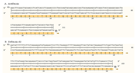 Since the actual DNA sequences of the genes encoding defensin-d2 and actifensin are unknown, the amino acid sequences available were reverse-translated using EMBOSS Backtranseq [60] (https://www.ebi.ac.uk/Tools/st/emboss_backtranseq, accessed on 6 June 2022). For the reverse-translation of defensin-d2, the Spinacia oleracea codon was used, while the Streptomyces coelicolor A3 codon was used to reverse-translate actifensin. The nucleotide sequences were synthesized as gene constructs cloned into pJET 1.2 by Genscript (Hongkong, China).
