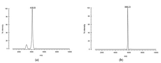 MALDI-TOF MS analysis and quantification of purified recombinant peptides: (a) MALDI-TOF MS analysis of purified recombinant actifensin showing a distinct peak corresponding to 4100.03 Da; (b) MALDI-TOF MS analysis of purified recombinant defensin-d2 showing a distinct peak corresponding to 5805.73 Da.
