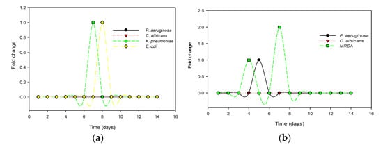 The resistance potentials of the sensitive test organisms to recombinant defensin-d2 and actifensin are presented in Figure 7. Out of the four sensitive organisms subjected to prolonged exposure, and serial passages of defensin-d2 to induce selective pressure, C. albicans and P. aeruginosa showed no fold changes in the MICs. E. coli and K. pneumoniae both showed 21-fold changes in the MICs, from 30 to 60 µg/mL, which remained unchanged for the rest of the assay (Figure 7a). For actifensin, C. albicans showed no resistance, despite repeated passages. However, P. aeruginosa showed a fold change in the MIC from 1448 to 2896 µg/mL, while the MIC of MRSA shifted from 23 to 181 µg/mL (Figure 7b). However, no MIC changes were observed after day 10 for all the organisms, which indicated that there was no resistance potential of the test organisms beyond 2–4 × the MICs of both recombinant peptides.