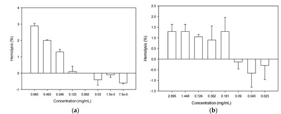To determine the toxicity of the recombinant peptides, the hemolytic activity was determined using mouse erythrocytes, and the results are presented in Figure 8. For defensin-d2, the hemolytic activity increased directly with the increase in the concentration. The maximum hemolysis of 2.89% was observed at a concentration of 985 µg/mL. It is worth noting that none of the MICs up to 8× the MICs determined for the test organisms showed any potential for hemolysis (Figure 8b). On the other hand, the hemolytic activity of actifensin was not concentration dependent. However, the hemolysis was less than 1.5% in all concentrations. Moreover, concentrations less than 181 µg/mL showed no potential for hemolysis.