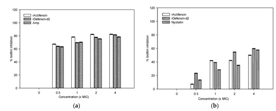 As shown in Figure 9, defensin-d2 and actifensin inhibited biofilm formation in MDR P. aeruginosa and C. albicans in a concentration-dependent manner. After treatment with 0.5–4× the MIC of defensin-d2 for 24 h, the percentages of biofilm mass in P. aeruginosa decreased by over 70%, which is comparable to the effect of ampicillin. Both recombinant peptides exhibited lesser biofilm inhibition against C. albicans; the percentage of biofilm mass decreased by ~40% when the concentration of peptides was up to 4× the MIC. This suggests that defensin-d2 and actifensin can effectively inhibit biofilm formation in MDR P. aeruginosa and C. albicans at an early stage.